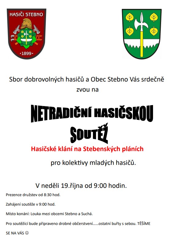 Hasičské klání na Stebenských pláních Kdy: 19. 10. 2025 09:00 – 19. 10. 2025 15:00 Kde: louka mezi obcemi Stebno a Suchá Kraj: Ústecký Typ akce: ostatní Zpět PRAVIDLA