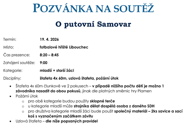 Samovar 2026 Kdy: 19. 4. 2026 09:00 – 19. 4. 2026 16:00 Kde: Libouchec Kraj: Ústecký Typ akce: sportovní Zpět POZVÁNKA